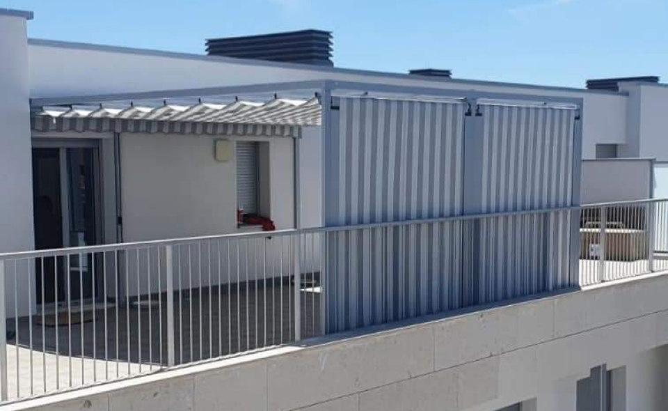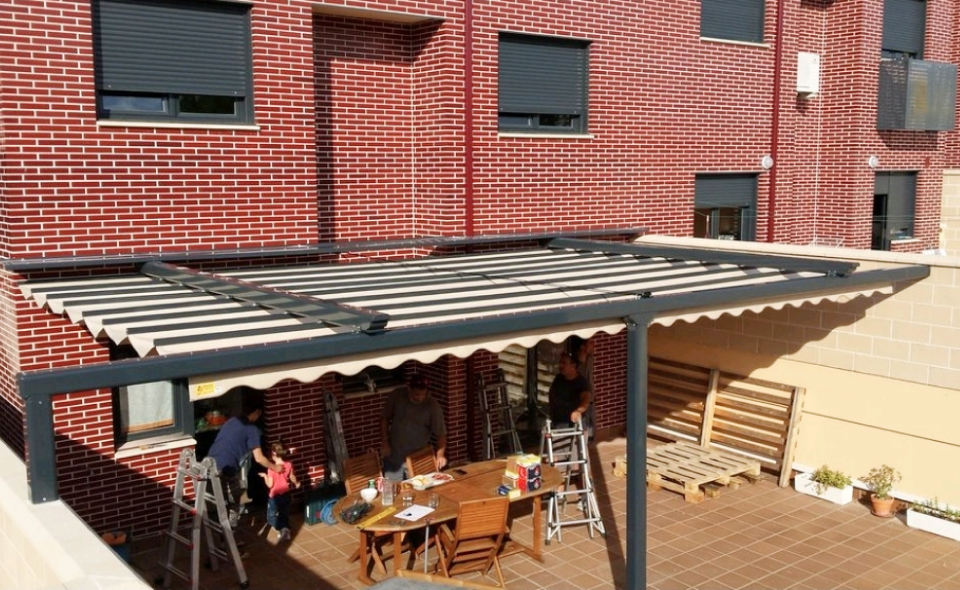 La pérgola es un toldo apropiado para cubrir grandes superficies con mayor seguridad, ya que al ir guiada y anclada en varios puntos, aguanta bastante mejor las inclemencias del tiempo.
