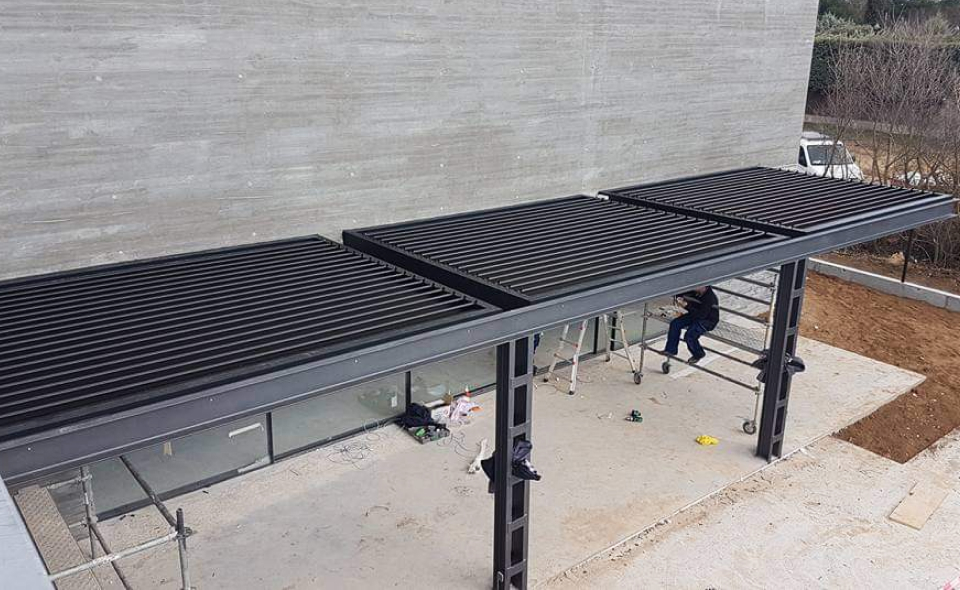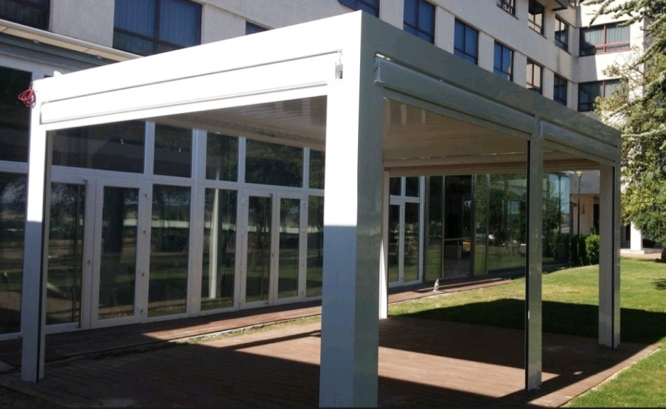 las pérgolas bioclimáticas están construidas totalmente en aluminio. Sólidas y robustas, con lamas orientables para aprovechar por completo el sol, pudiendo reflejarlo hacia el interior de la estructura y disfrutar de la estancia tanto en invierno como en verano.